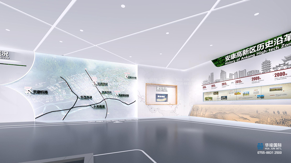 新安康門戶園區規劃館設計項目由華竣數創執行整體設計施工,華竣數創規劃館設計部以“智慧城市展廳”為起點;結合數字沙盤、數字影院、虛擬現實、互動多媒體等技術,打造承載城市歷史、展現城市現在、展望城市未來的智慧規劃館。