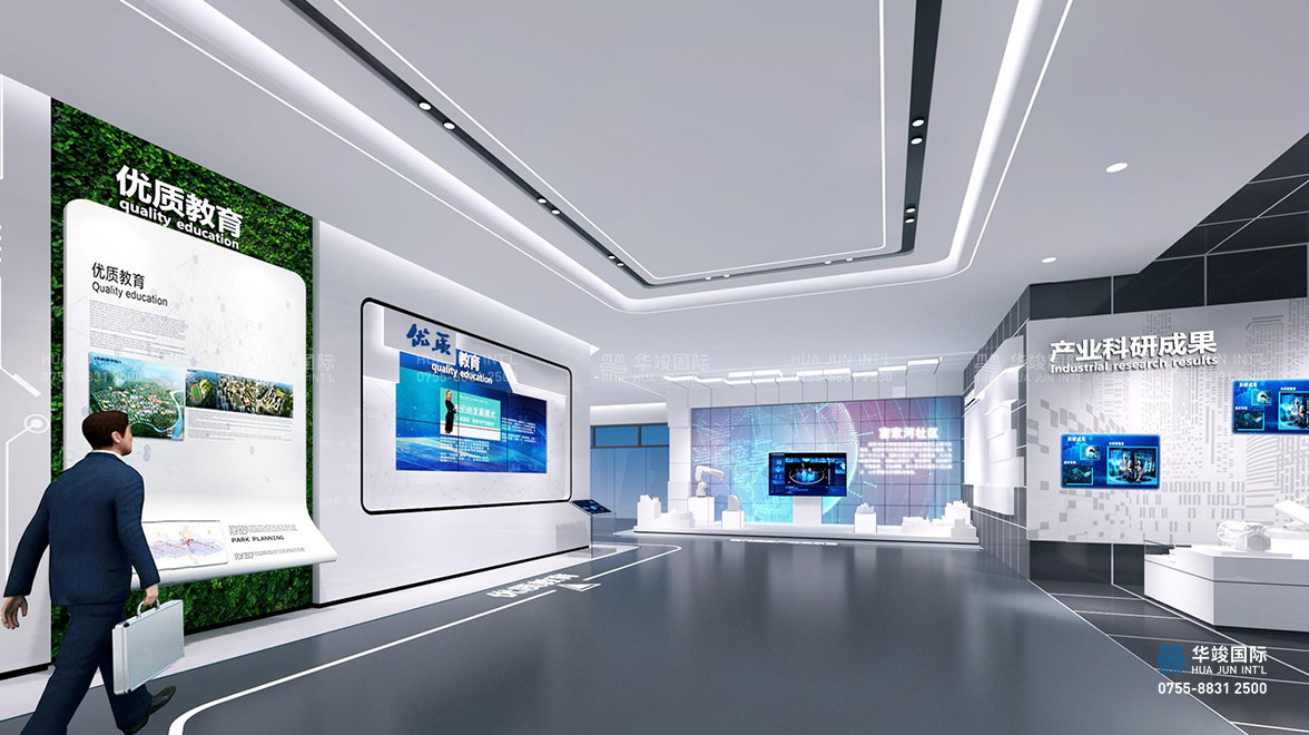 該展館設計不僅是在物理空間上的創新,更是發展理念上的創新;其利用開放的流線、獨具美感和內涵的造型、新穎的展項形式打造高新區城市規劃展館,并使用大面積的白、健康自然的的康養綠突出生態新生活,科技智慧藍調動智能新制造,營造舒適健康的參觀氛圍。