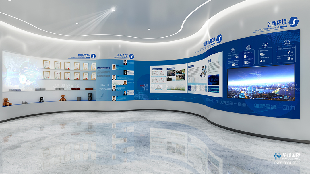 天花部分吊裝造型營造科技現代的空間氛圍,行如流水般的曲面拼接屏幕墻將千百年來人類對硒的探索與發現一一鋪陳開,參觀者可多點觸控屏幕,深入了解“什么是硒”、“硒與自然”、硒的物理特性和化學特性等知識內容。