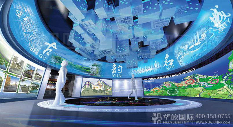 從空中、地上、地下打造三位一體的海口大格局。以360度弧幕投影圍繞海南文化篆刻字造型,配合地面數(shù)字沙盤,全方位一體化展示海口的萬象更新。