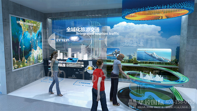 全域旅游交通,以海口當前重點規(guī)劃的美蘭機場、高速公路、跨海大橋等為核心。一方面通過實體模型反映城市交通的立體格局,另一方面結(jié)合顯示大屏,全面體現(xiàn)海口交通的便捷,為全域旅游奠定基礎(chǔ)。