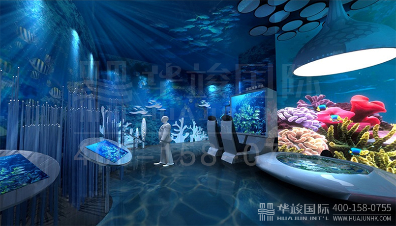 通過3D投影、多屏觸控、光纖燈等現(xiàn)代科技手法,呈現(xiàn)魚類、珊瑚等豐富多彩的海洋場景。設(shè)置“深海巡游”體驗展項,參觀者可通過坐上特制設(shè)備,身臨其境遨游海洋深處。整個空間相對封閉,全方位營造“海”之意境。
