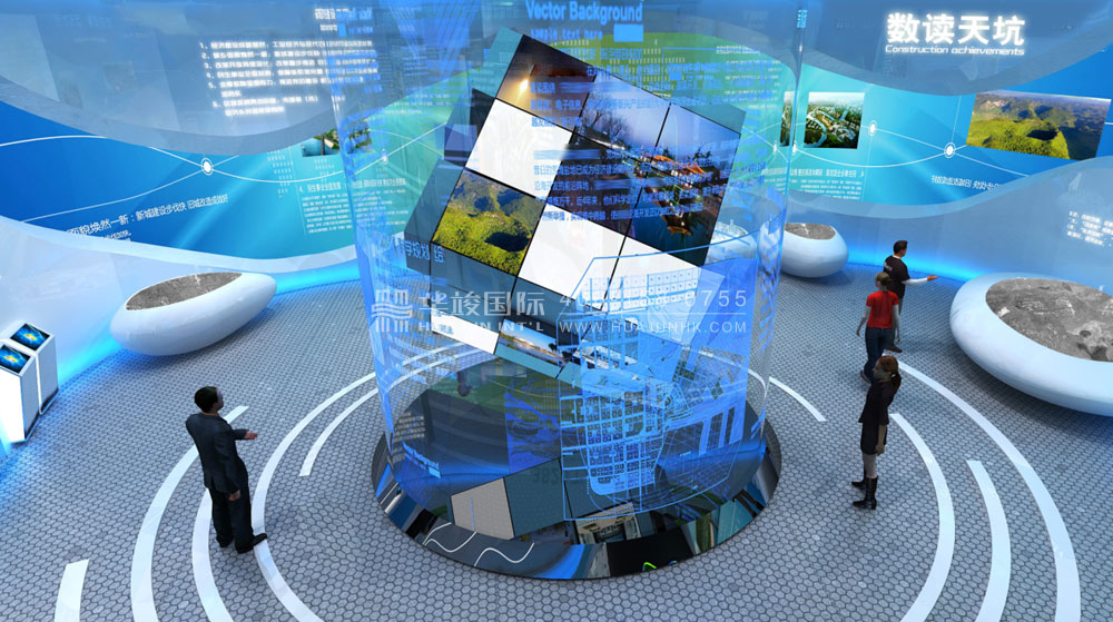 該展廳設(shè)計以“中國天眼”為設(shè)計靈感,用天眼(天坑)的科幻模擬造型,結(jié)合樓體外觀,整體打造“開眼看世界”的印象格局。利用磁懸浮技術(shù),設(shè)置多個球幕,在空中懸浮上升、下降,讓游客體驗(yàn)天體運(yùn)動場景,各球幕呈現(xiàn)當(dāng)?shù)卮硇跃坝^。并通過虛擬導(dǎo)游的方式,游客可具體了解本地各個景區(qū)的信息,合理規(guī)劃旅游行程安排。還以交通規(guī)劃切入,按動觸控屏,即可點(diǎn)亮河流帶,實(shí)現(xiàn)實(shí)時交通交互;可查詢到周邊的交通規(guī)劃,吃、住、行、游、購、娛旅游產(chǎn)業(yè)鏈等。